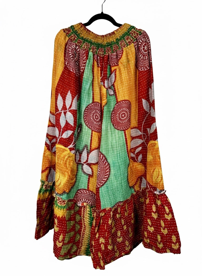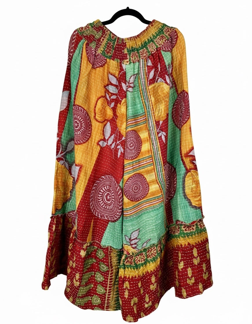 Our vintage styles have lived a full life before becoming the designs in our shop. Fabrics may have small threads or holes in the layers. Color inconsistency or small stains may be present. The saris are sewn together and extend the life of each design. Imperfections should be celebrated.
