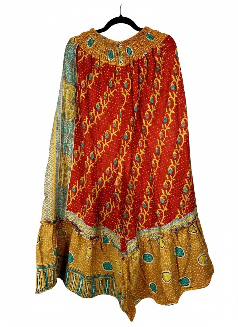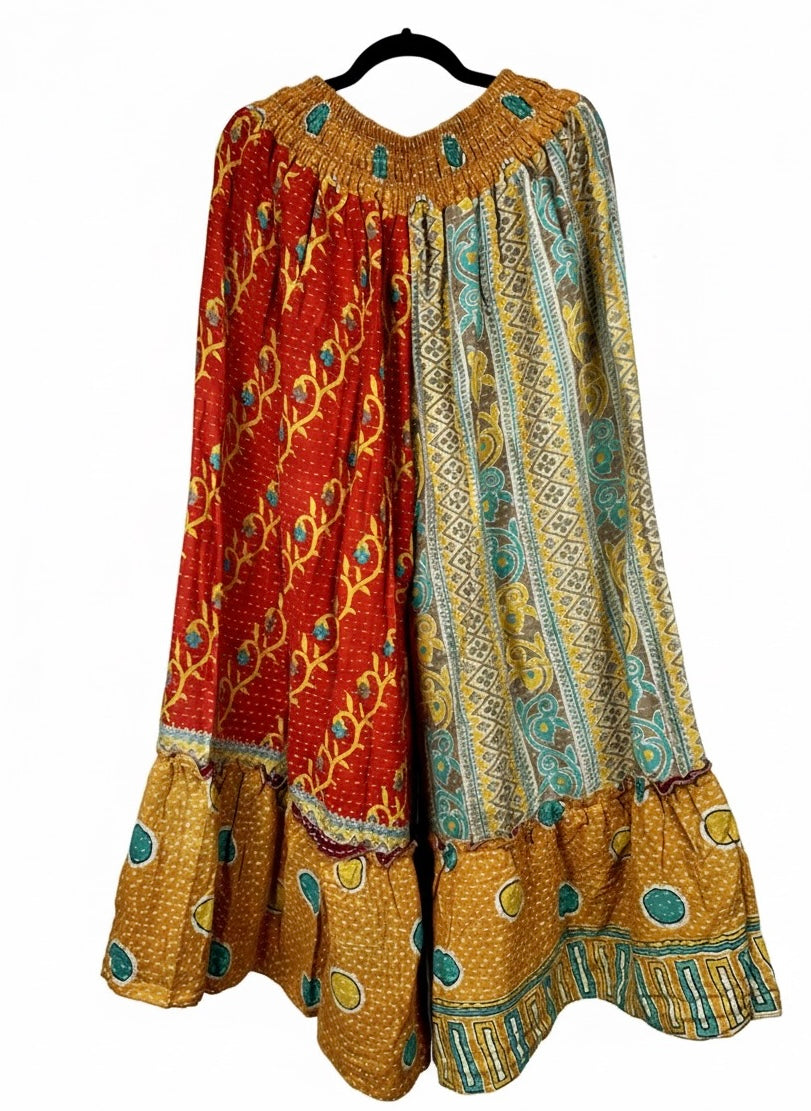 Our vintage styles have lived a full life before becoming the designs in our shop. Fabrics may have small threads or holes in the layers. Color inconsistency or small stains may be present. The saris are sewn together and extend the life of each design. Imperfections should be celebrated.