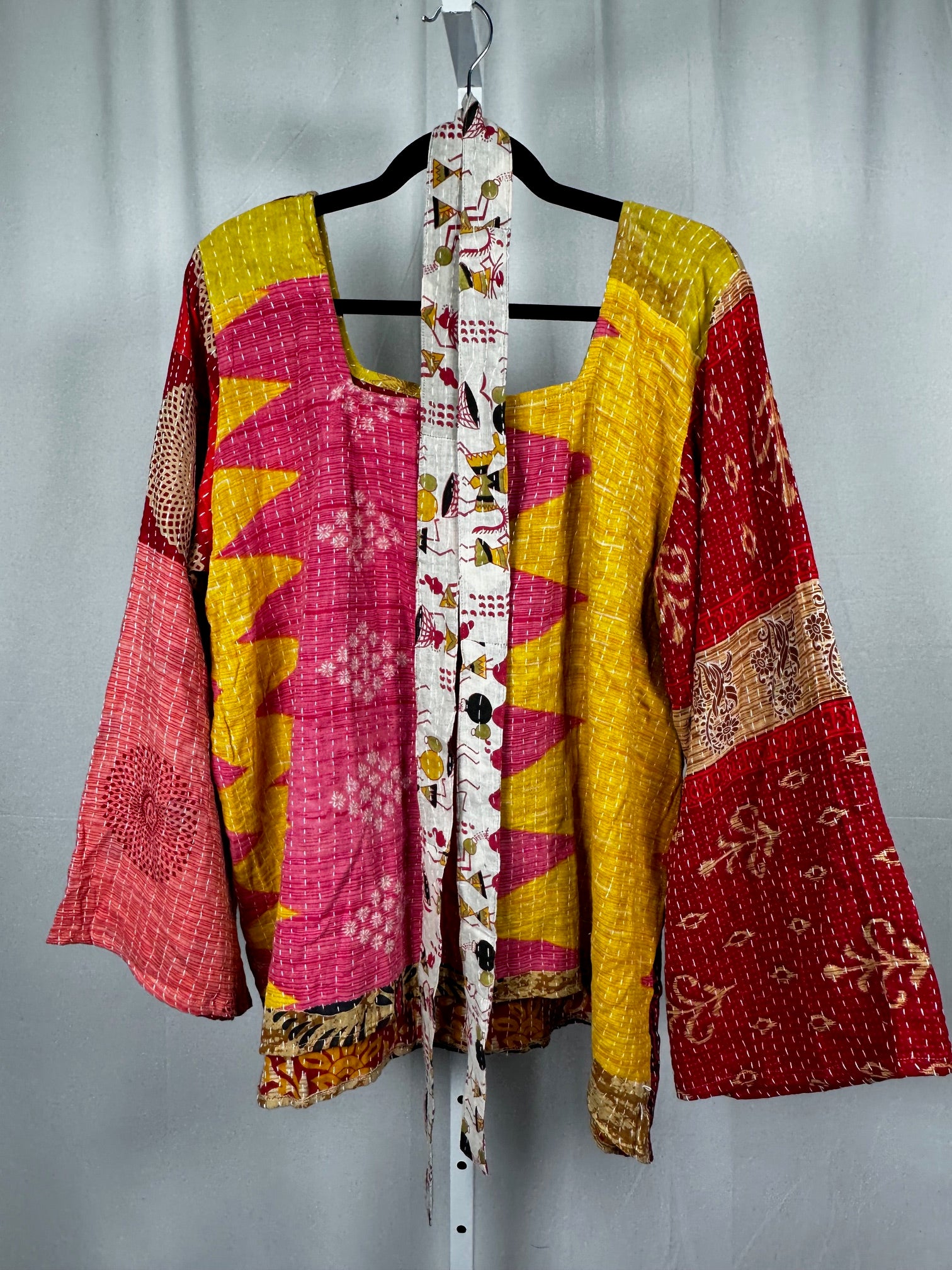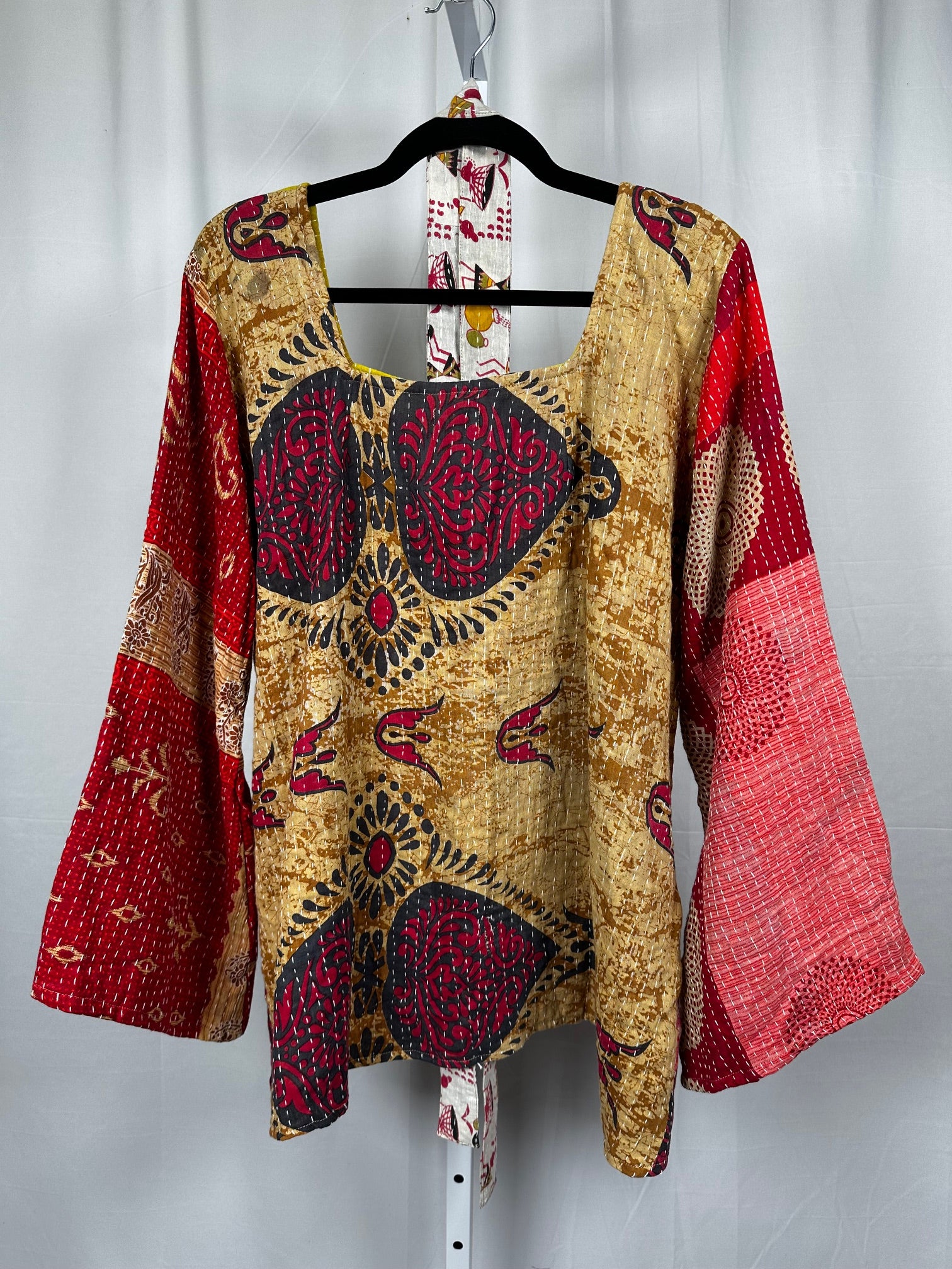 Our vintage styles have lived a full life before becoming the designs in our shop. Fabrics may have small threads or holes in the layers. Color inconsistency or small stains may be present. The saris are sewn together and extend the life of each design. Imperfections should be celebrated.