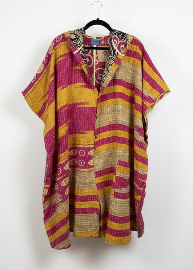 Our vintage styles have lived a full life before becoming the designs in our shop. Fabrics may have small threads or holes in the layers. Color inconsistency or small stains may be present. The saris are sewn together and extend the life of each design. Imperfections should be celebrated.