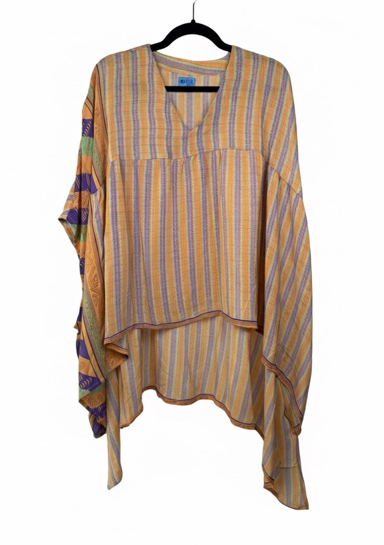 Our vintage styles have lived a full life before becoming the designs in our shop. Fabrics may have small threads or holes in the layers. Color inconsistency or small stains may be present. The saris are sewn together and extend the life of each design. Imperfections should be celebrated.