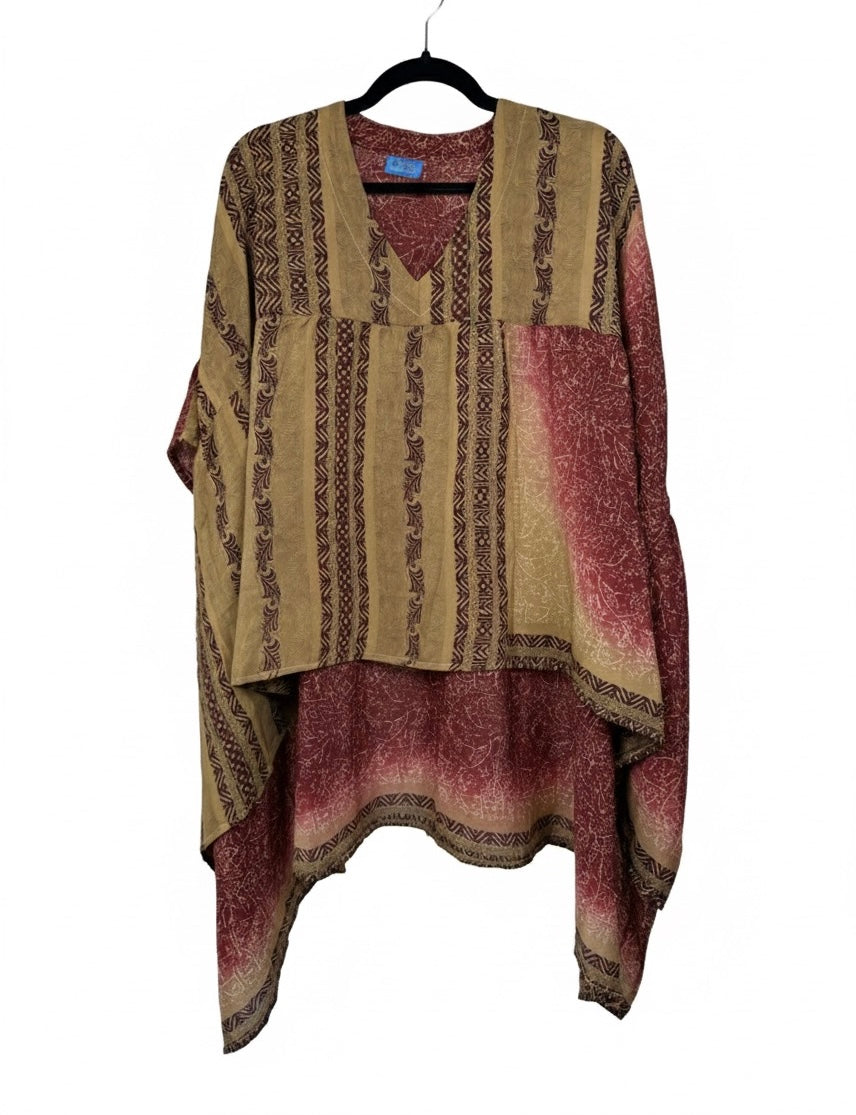 Our vintage styles have lived a full life before becoming the designs in our shop. Fabrics may have small threads or holes in the layers. Color inconsistency or small stains may be present. The saris are sewn together and extend the life of each design. Imperfections should be celebrated.