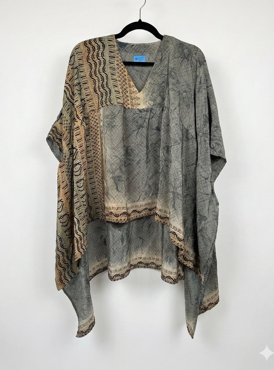 Our vintage styles have lived a full life before becoming the designs in our shop. Fabrics may have small threads or holes in the layers. Color inconsistency or small stains may be present. The saris are sewn together and extend the life of each design. Imperfections should be celebrated.