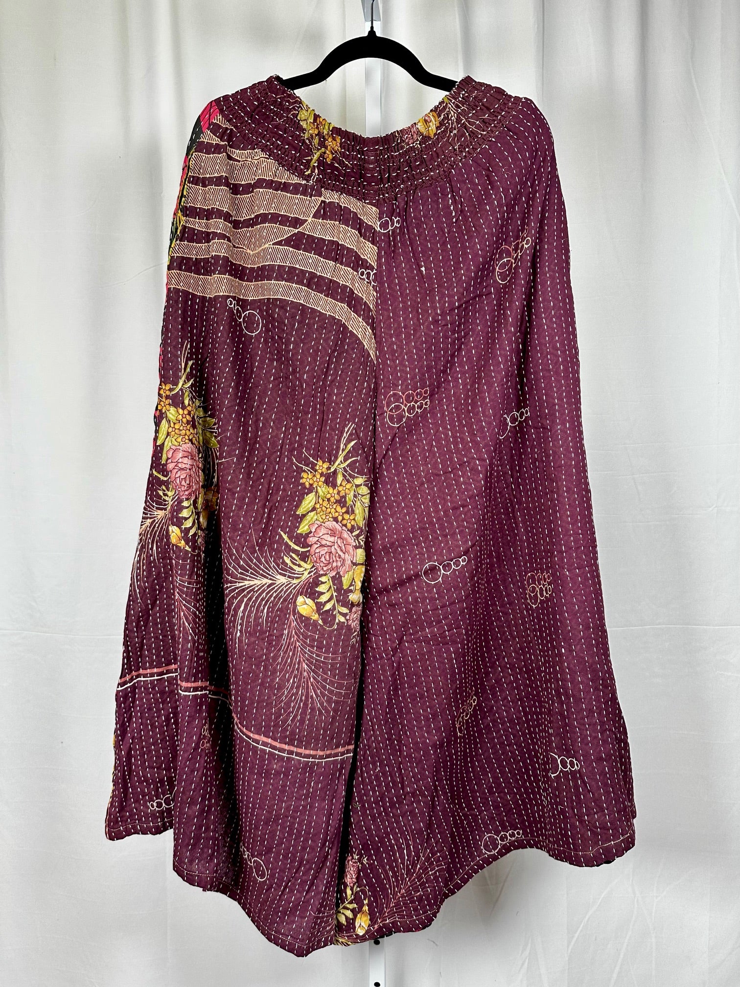 Our vintage styles have lived a full life before becoming the designs in our shop. Fabrics may have small threads or holes in the layers. Color inconsistency or small stains may be present. The saris are sewn together and extend the life of each design. Imperfections should be celebrated.