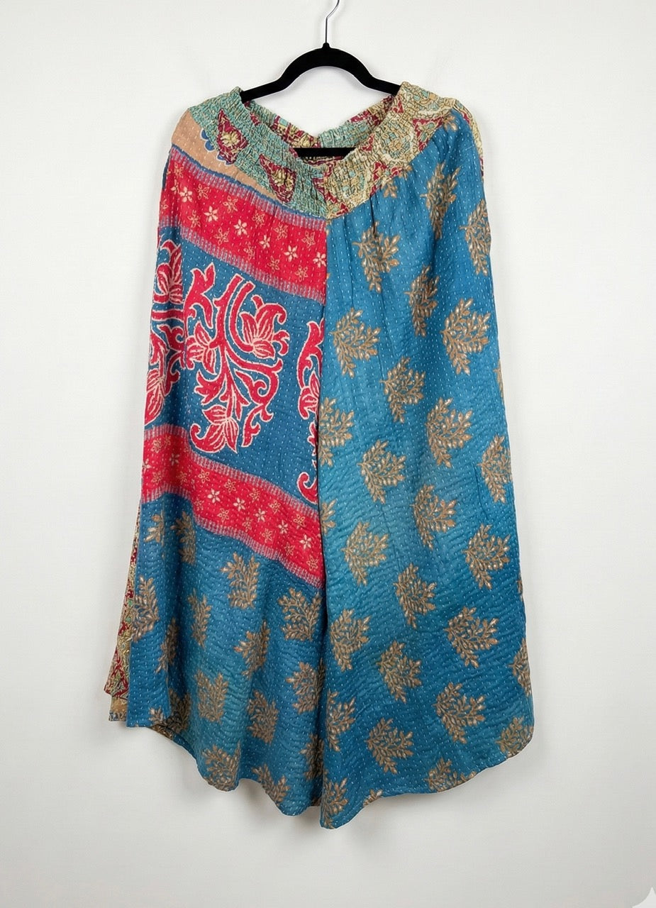 Our vintage styles have lived a full life before becoming the designs in our shop. Fabrics may have small threads or holes in the layers. Color inconsistency or small stains may be present. The saris are sewn together and extend the life of each design. Imperfections should be celebrated.