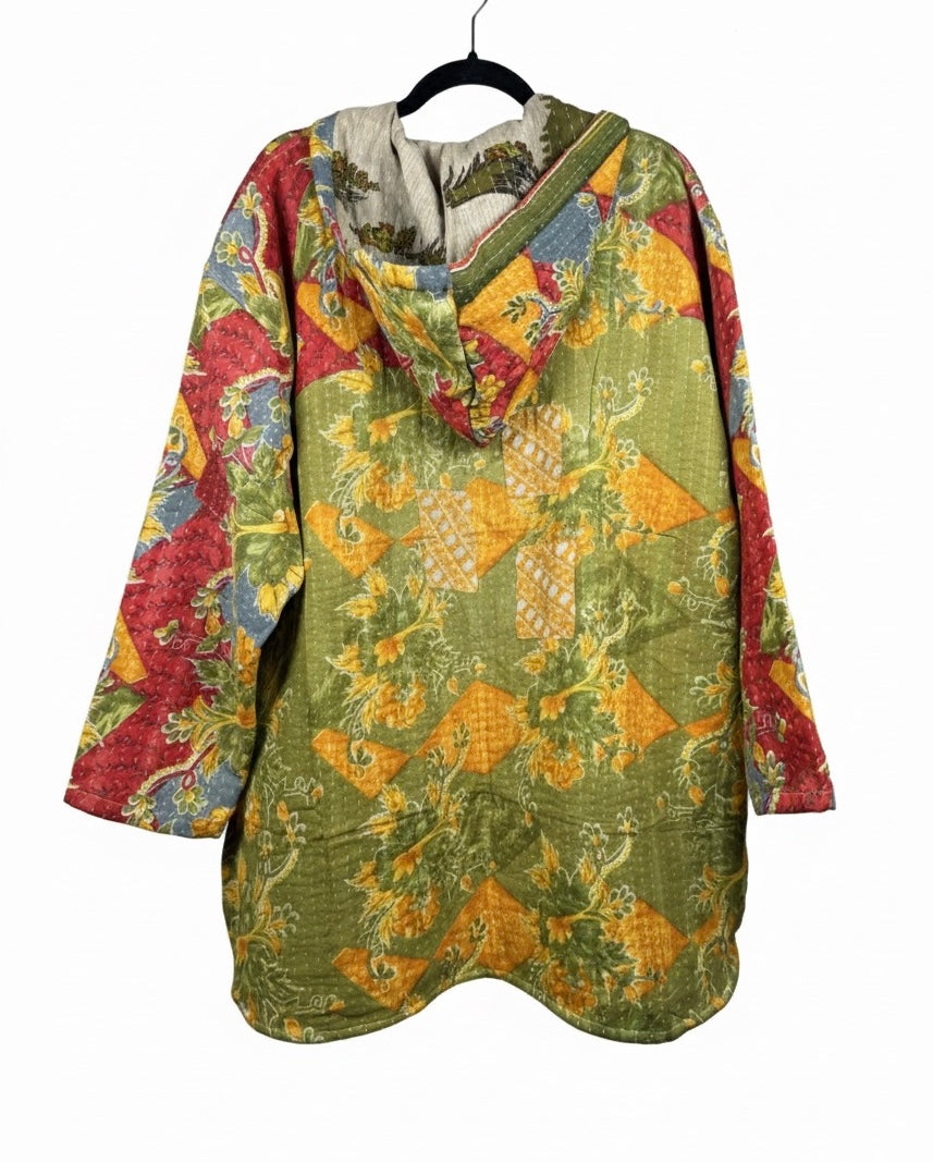 Our vintage styles have lived a full life before becoming the designs in our shop. Fabrics may have small threads or holes in the layers. Color inconsistency or small stains may be present. The saris are sewn together and extend the life of each design. Imperfections should be celebrated.