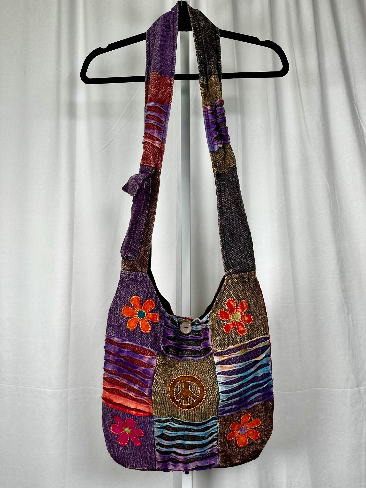 Measuring 14.5" by 13" with a 20" strap, this Peace Monk Bag features vibrant multicolored cotton that adds a lively touch to any outfit.