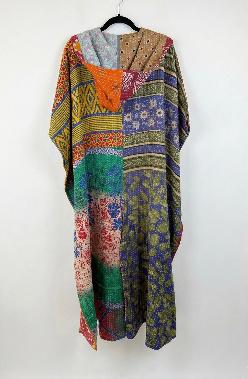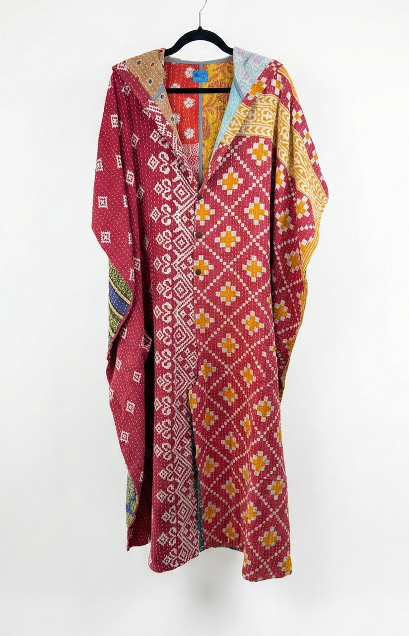 Our vintage styles have lived a full life before becoming the designs in our shop. Fabrics may have small threads or holes in the layers. Color inconsistency or small stains may be present. The saris are sewn together and extend the life of each design. Imperfections should be celebrated.