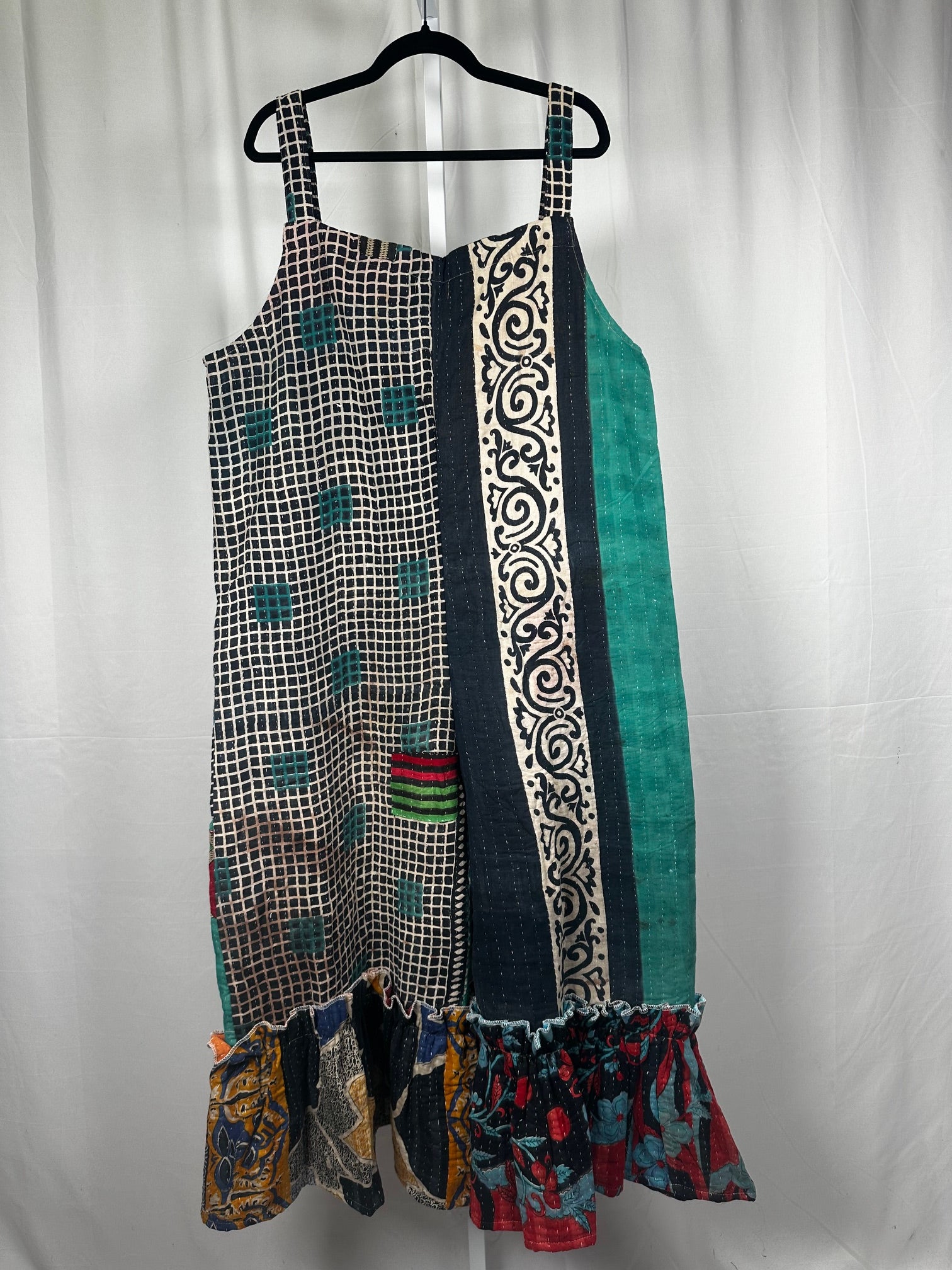 Elevate your style with the Selena ruffle jumpsuit, crafted from authentic vintage sari kantha stitch fabric.