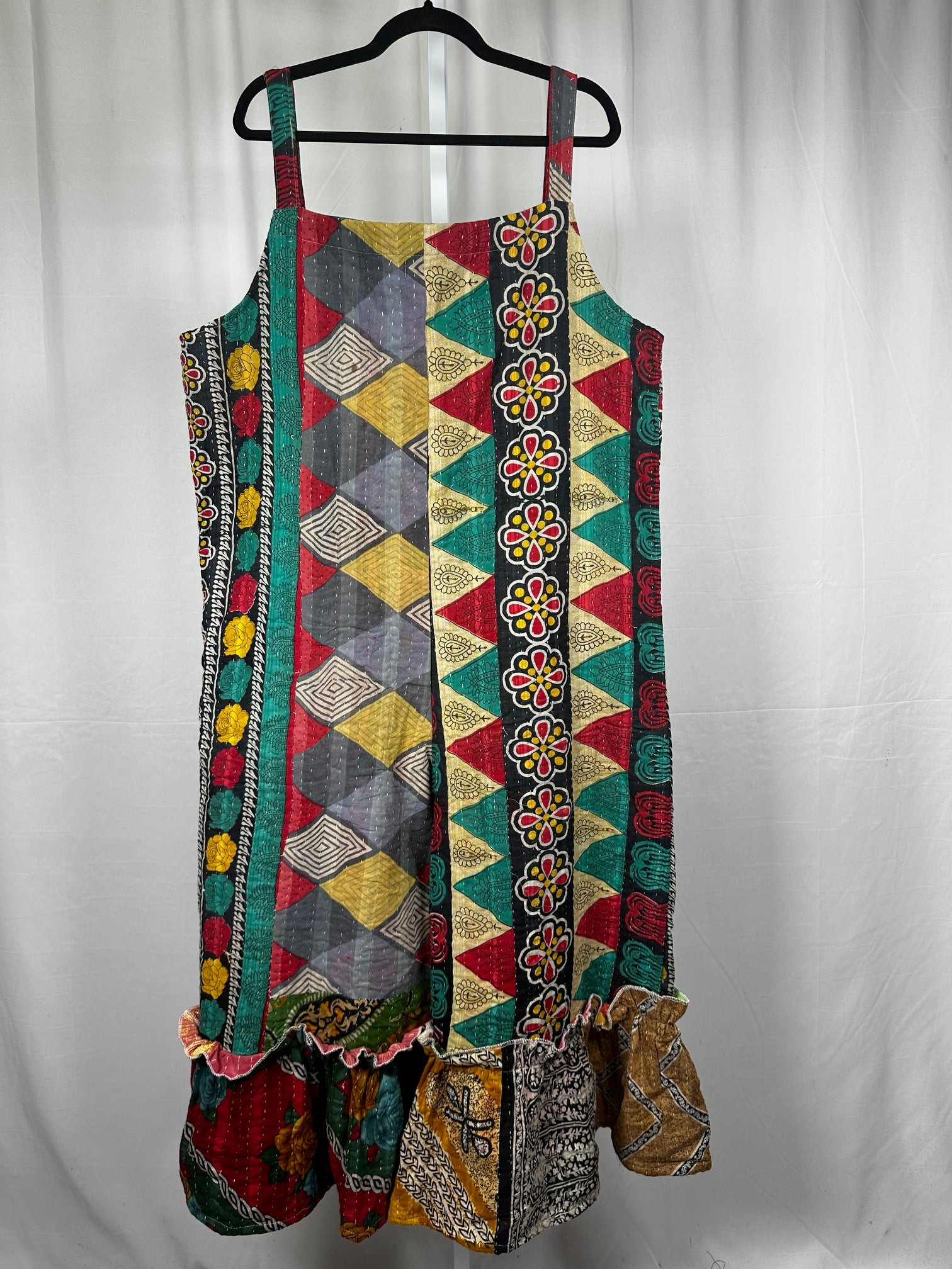 Elevate your style with the Selena ruffle jumpsuit, crafted from authentic vintage sari kantha stitch fabric.