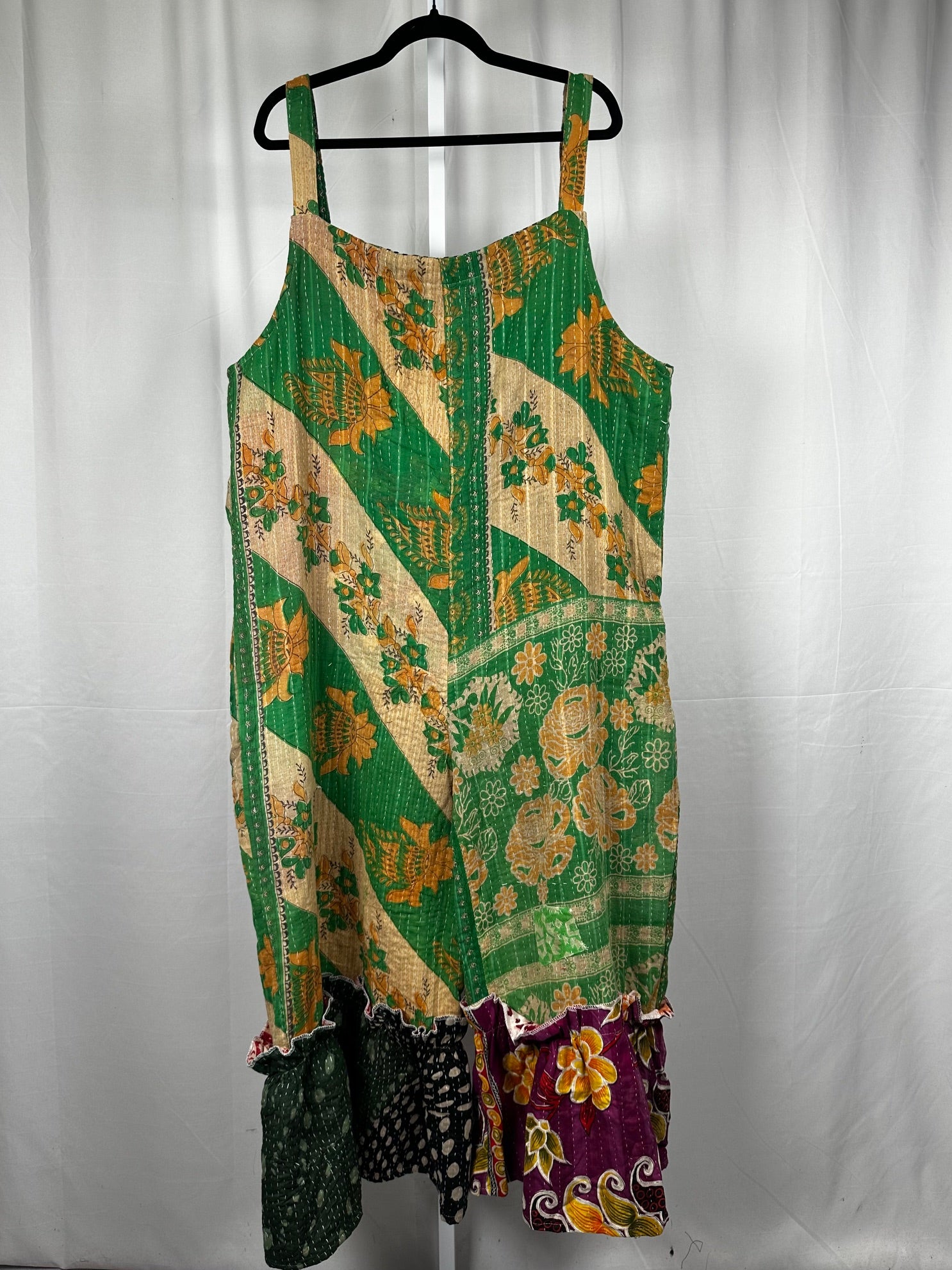 Elevate your style with the Selena ruffle jumpsuit, crafted from authentic vintage sari kantha stitch fabric.