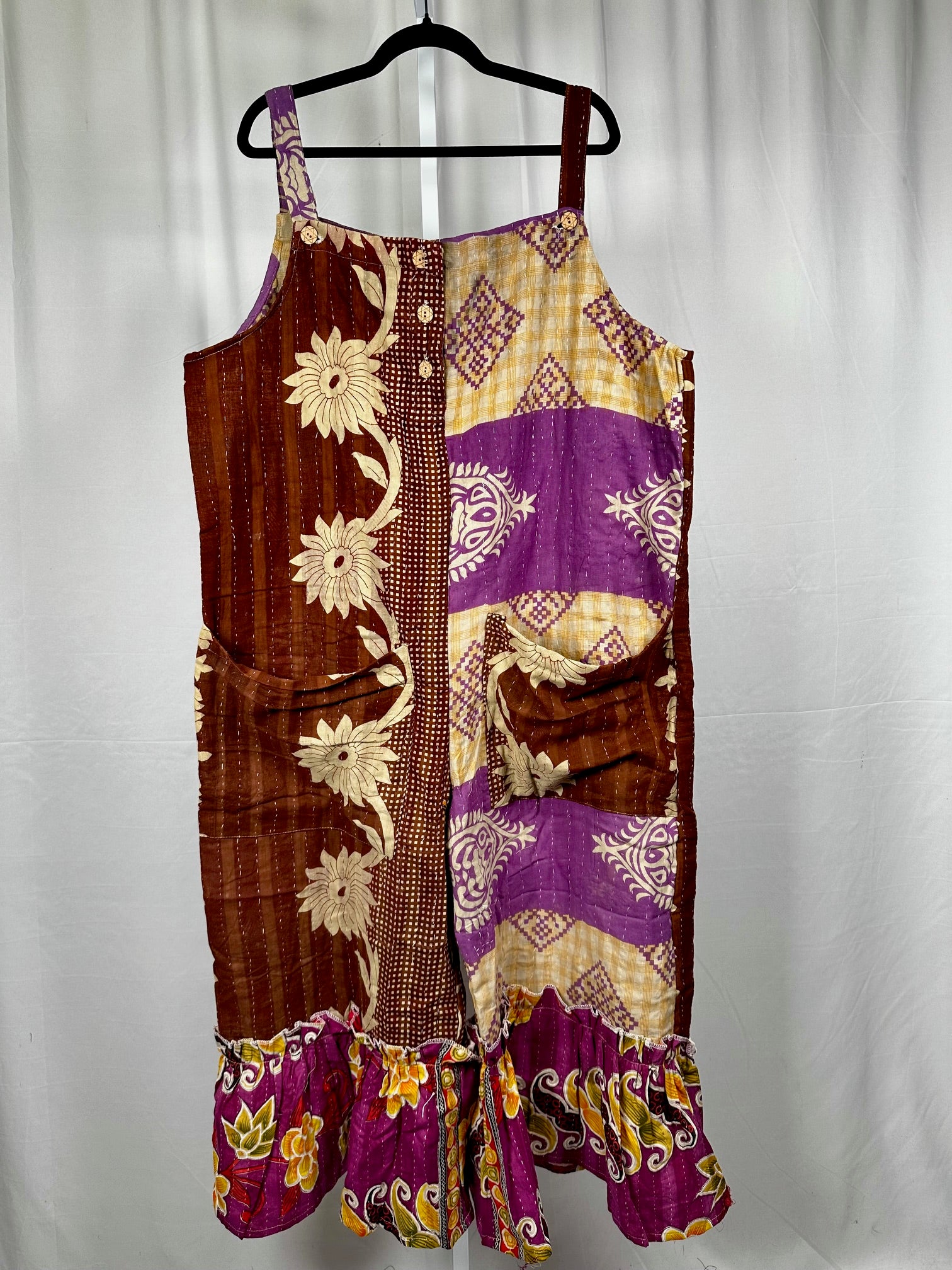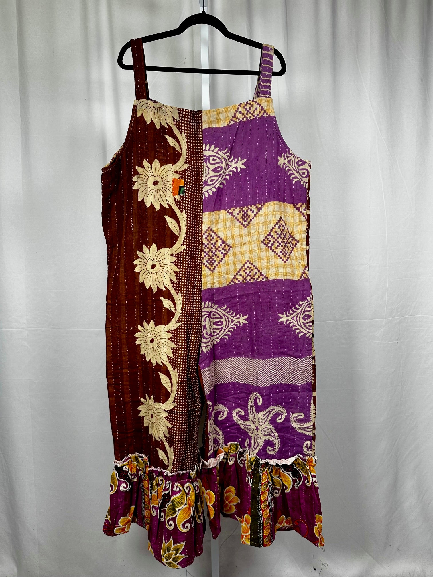 Elevate your style with the Selena ruffle jumpsuit, crafted from authentic vintage sari kantha stitch fabric.