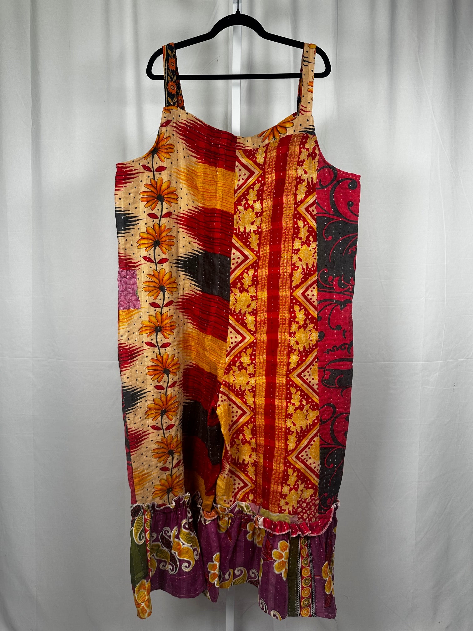 Elevate your style with the Selena ruffle jumpsuit, crafted from authentic vintage sari kantha stitch fabric.