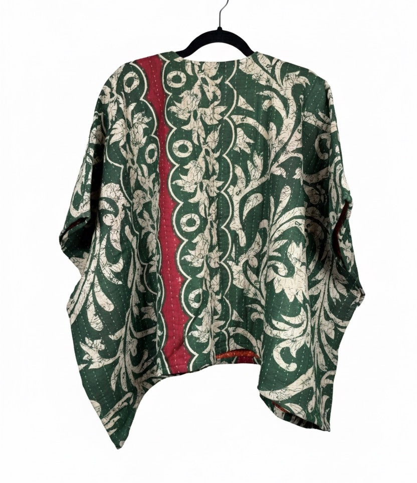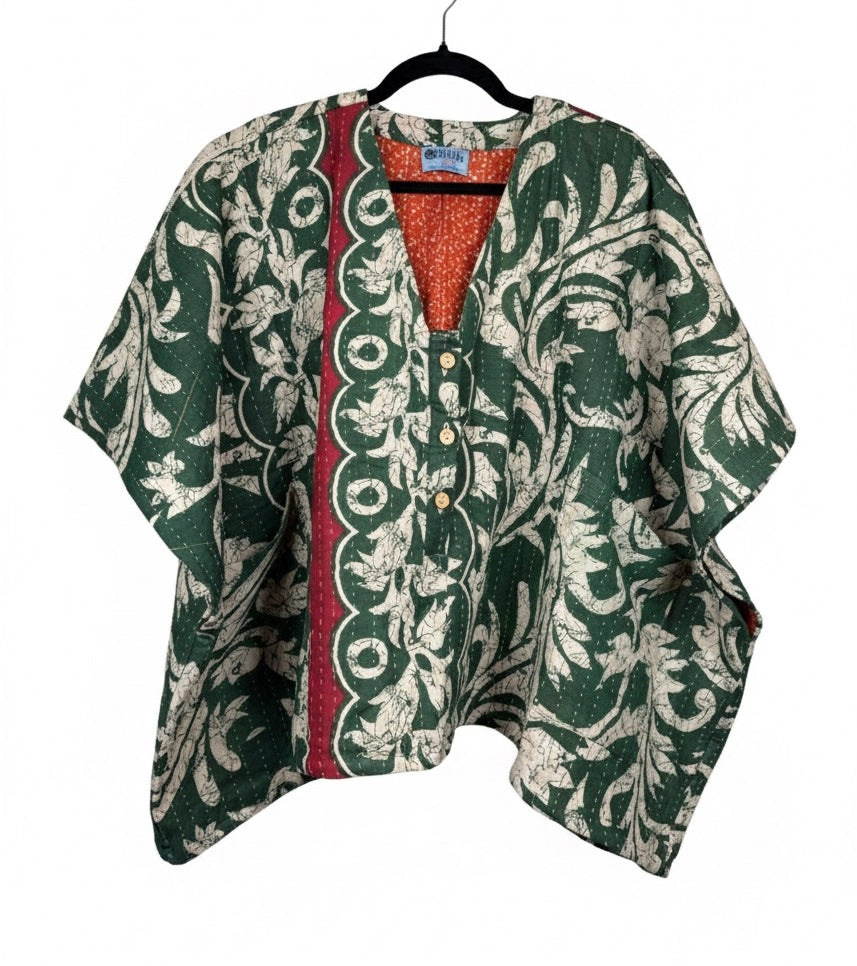 Our vintage styles have lived a full life before becoming the designs in our shop. Fabrics may have small threads or holes in the layers. Color inconsistency or small stains may be present. The saris are sewn together and extend the life of each design. Imperfections should be celebrated.