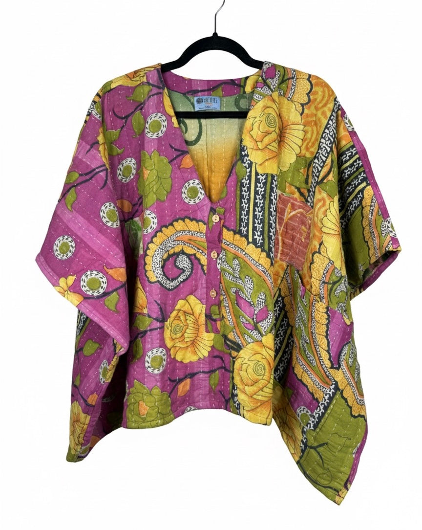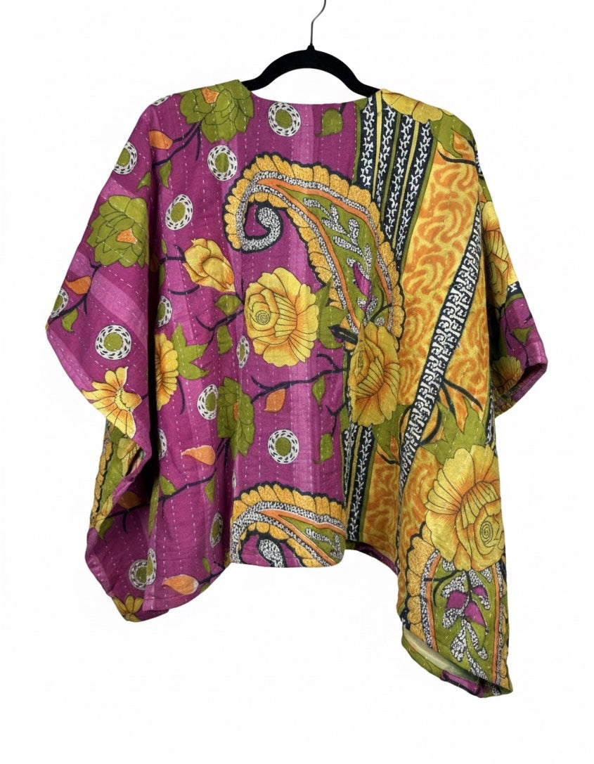 Our vintage styles have lived a full life before becoming the designs in our shop. Fabrics may have small threads or holes in the layers. Color inconsistency or small stains may be present. The saris are sewn together and extend the life of each design. Imperfections should be celebrated.