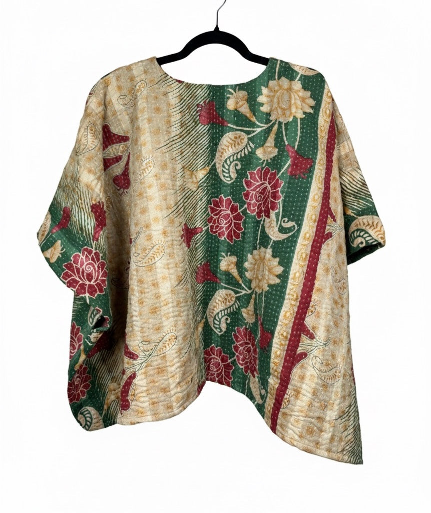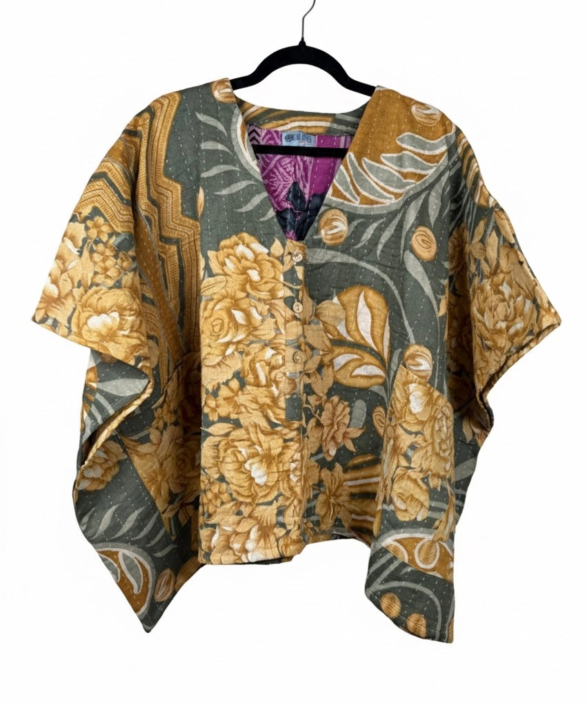 Our vintage styles have lived a full life before becoming the designs in our shop. Fabrics may have small threads or holes in the layers. Color inconsistency or small stains may be present. The saris are sewn together and extend the life of each design. Imperfections should be celebrated.