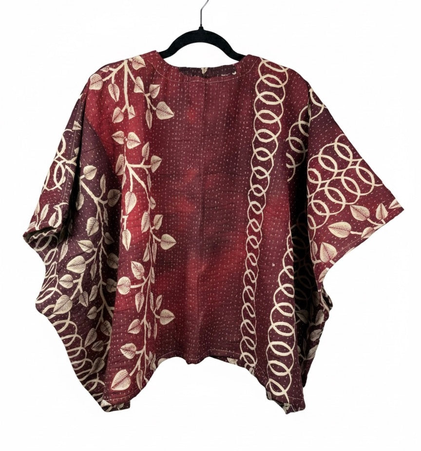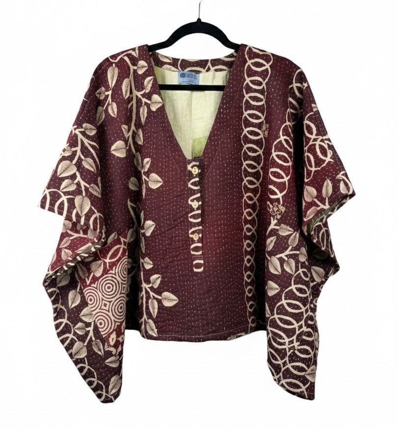 Our vintage styles have lived a full life before becoming the designs in our shop. Fabrics may have small threads or holes in the layers. Color inconsistency or small stains may be present. The saris are sewn together and extend the life of each design. Imperfections should be celebrated.