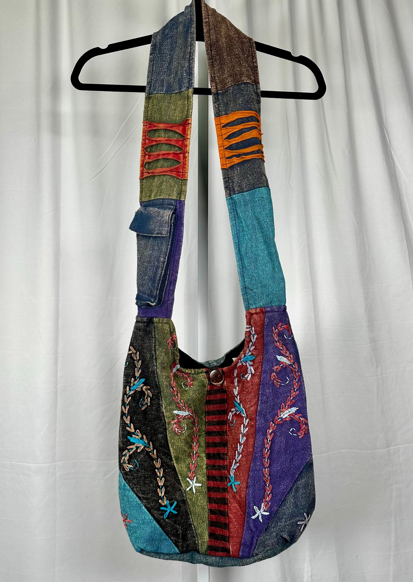 Measuring 14" by 11" with a 20" strap, this Stonewashed Monk Bag features vibrant multicolor cotton, combining style and comfort for everyday use.