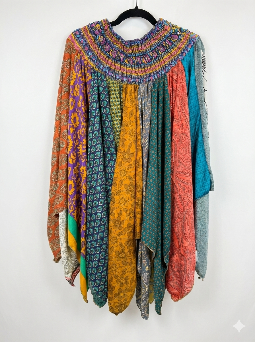 This exquisite piece showcases premium silk fabric paired with eye-catching patchwork details that transform an everyday essential into a conversation-starting statement.