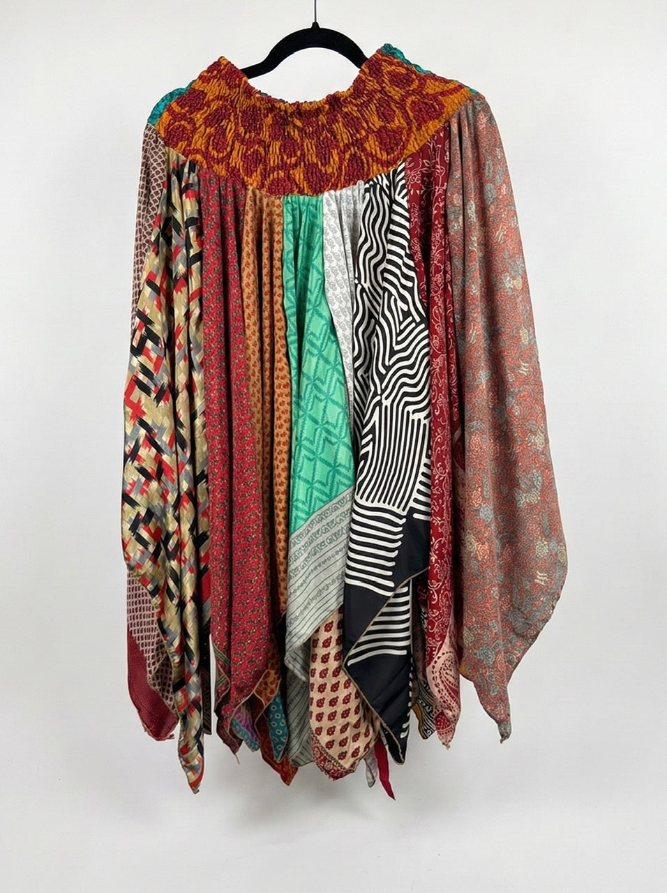 This exquisite piece showcases premium silk fabric paired with eye-catching patchwork details that transform an everyday essential into a conversation-starting statement.