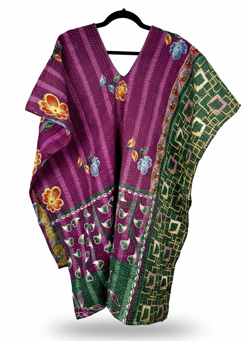 Our vintage styles have lived a full life before becoming the designs in our shop. Fabrics may have small threads or holes in the layers. Color inconsistency or small stains may be present. The saris are sewn together and extend the life of each design. Imperfections should be celebrated.